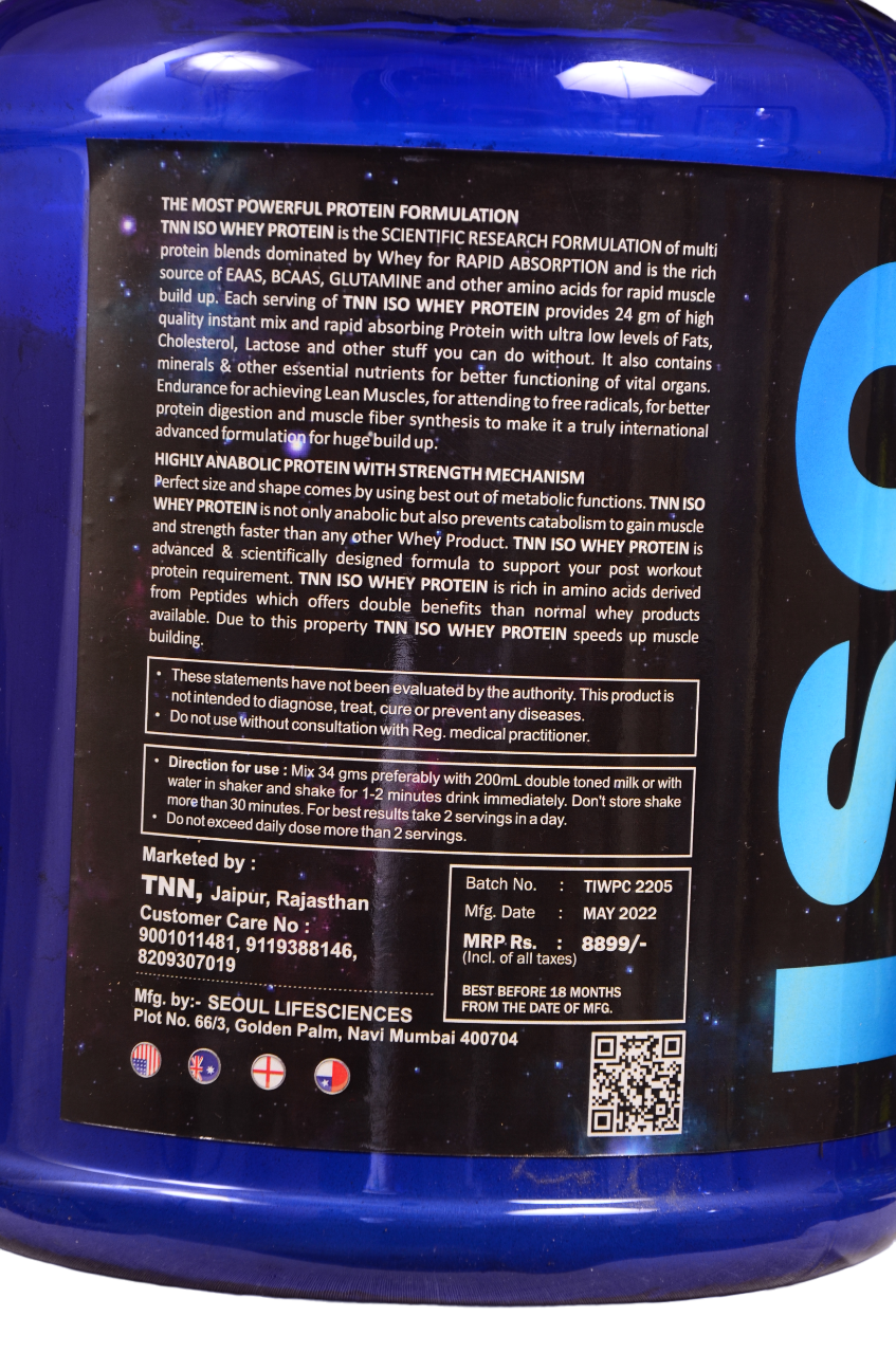 TNN ISO WHEY PROTEIN is the SCIENTIFIC RESEARCH FORMULATION of multiprotein blends dominated by Whey for RAPID ABSORPTION and is the rich source of EAAS, BCAAS, GLUTAMINE and other amino acids for rapid muscle build up. Each serving of TNN ISO WHEY PROTEIN provides 27 gm of high quality instant mix and rapid absorbing Protein with ultra low without. It also contains minerals & other essential nutrients for better functioning of vital organs. Endurance for achieving Lean Muscles, for attending to free radicals, for better protein digestion ae fiber synthesis to make it a truly international advanced formulation for huge build up.
