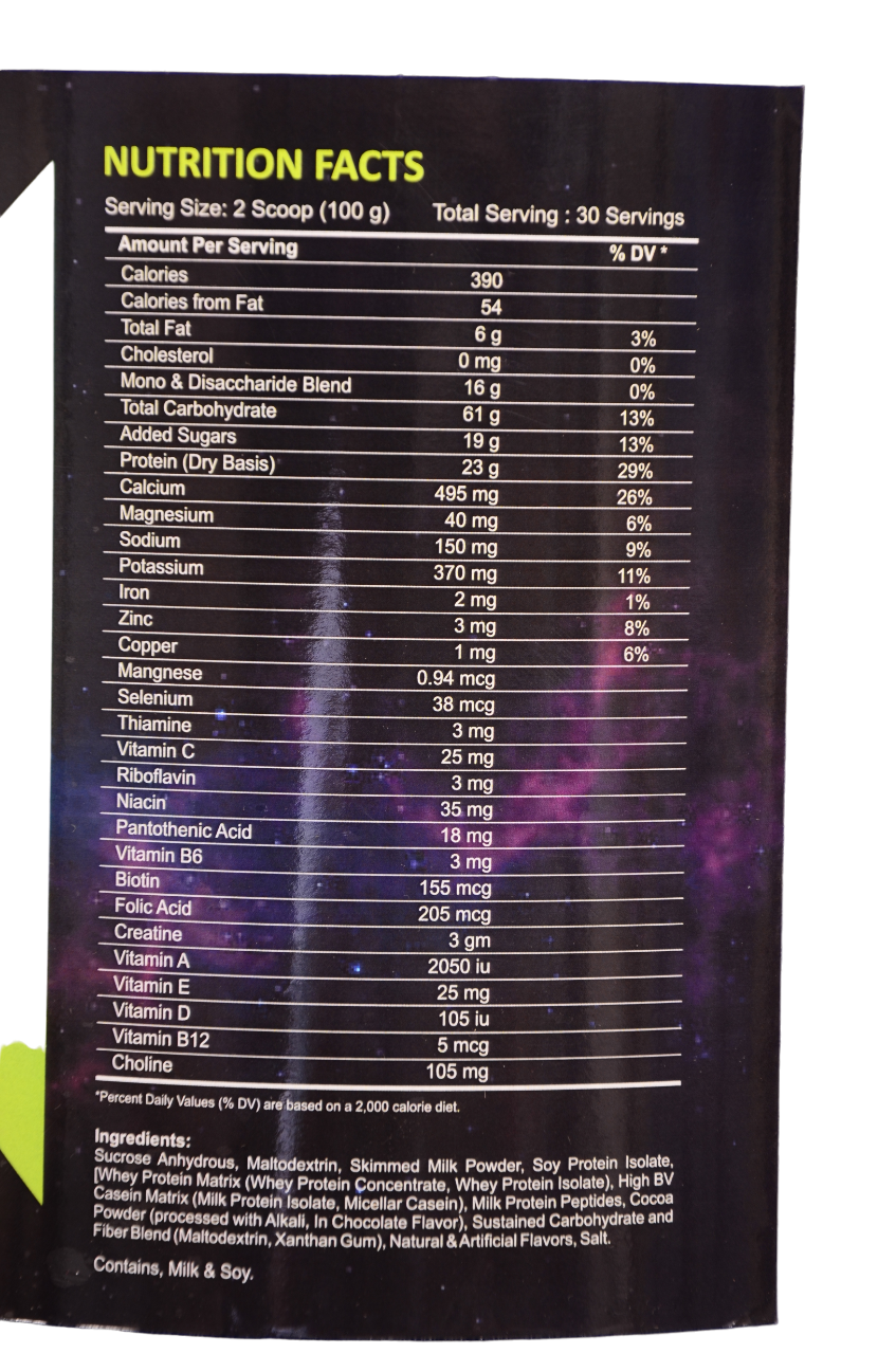 Overall, this formulation seems to be aimed at providing a blend of carbohydrates, proteins, and flavors to create a balanced meal replacement or protein shake.